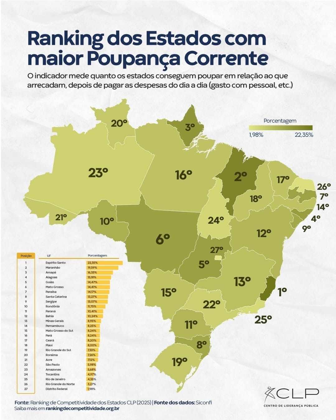 O que isso significa? A poupança corrente é considerada um dos principais indicadores da saúde fiscal dos estados. Ela mede quanto sobra da arrecadação depois que o governo paga as despesas correntes necessárias para manter os serviços públicos funcionando.