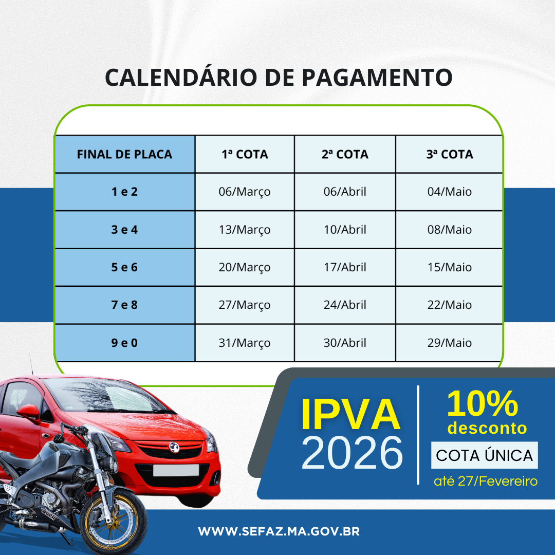 O Governo do Maranhão, por meio da Secretaria de Estado da Fazenda (Sefaz-MA), lançou o calendário de pagamento do Imposto sobre Propriedade de Veículos Automotores (IPVA) do exercício de 2026, conforme a Portaria nº 405/2025.